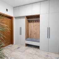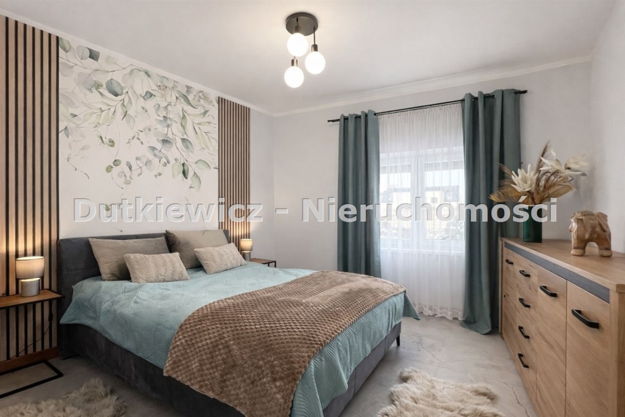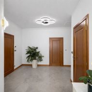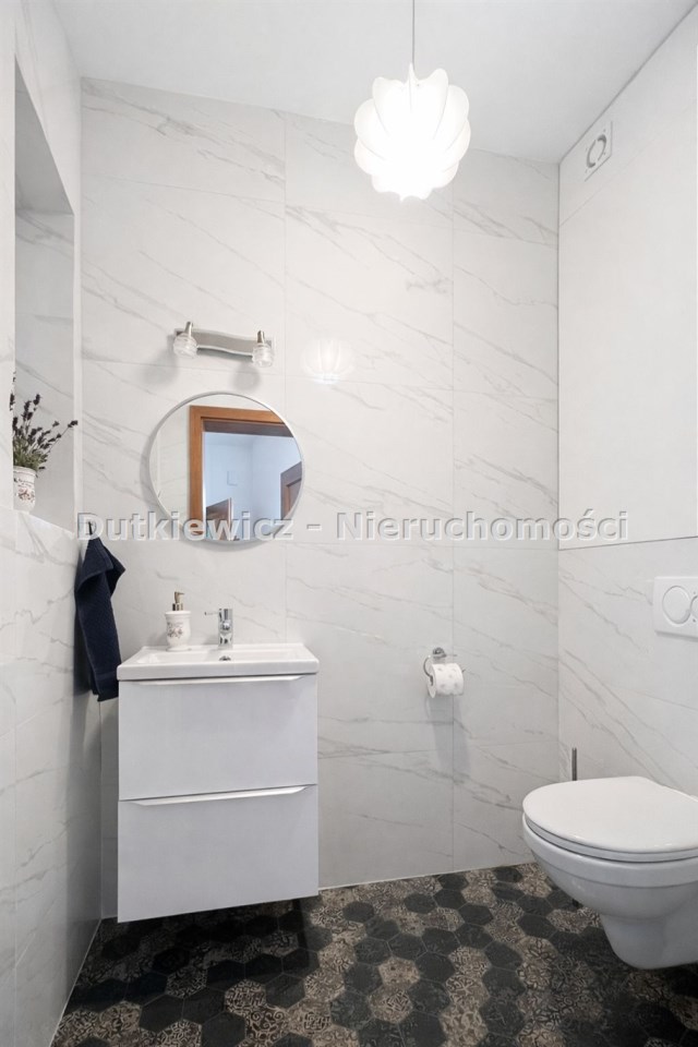 Na podłogach zastosowano kamień i kafelki, a całość jest gotowa do użytkowania bez dodatkowych nakładów. Wnętrze dopełnia jednolita stolarka drewniana - drzwi, ościeżnice oraz listwy przypodłogowe wykonane w tej samej stylistyce, podkreślające konsekwencję wykończenia i jakość zastosowanych materiałów.
