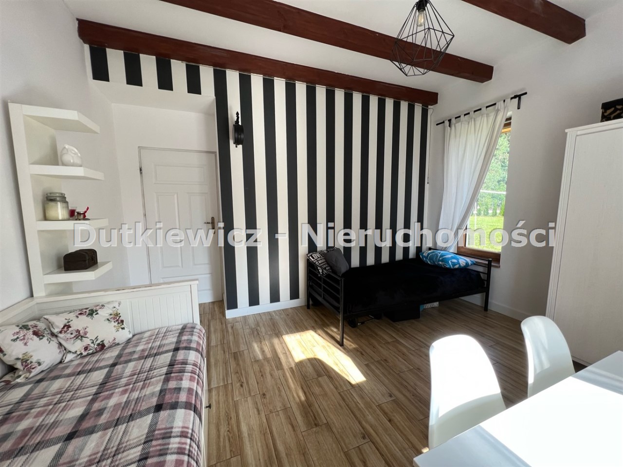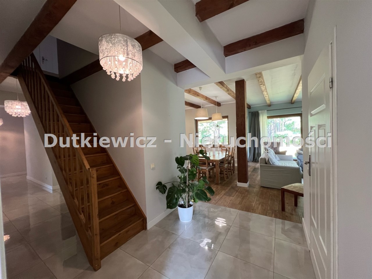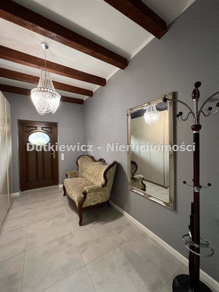 W holu duża pakowna szafa. W kuchni meble w zabudowie z wyspą, wyposażenie AGD (lodówko- side by side, płyta indukcyjna, zmywarka). Kuchnia z salonem łączy rozkładany stół z 6 krzesłami. W części wypoczynkowej wygodne 2 sofy i stolik kawowy. Ogród ( zestaw ogrodowy )